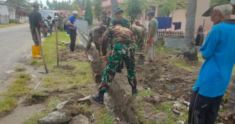 Polewali Mandar — Sejumlah personel TNI dari Koramil 1402-03/Campalagian bersama masyarakat melaksanakan kegiatan gotong royong pembersihan saluran drainase di Desa Panyampa, Kecamatan Campalagian, Kabupaten Polewali Mandar, Selasa (28/10/2025).