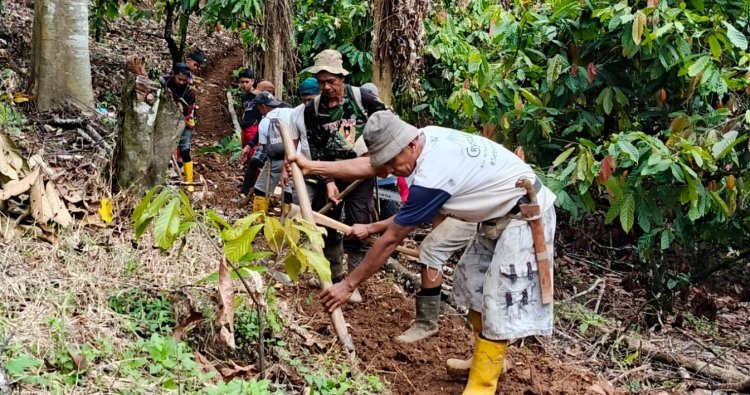 Suasana gotong royong terlihat penuh semangat, di mana warga membawa alat kerja sederhana seperti parang, cangkul, dan sekop untuk membuka jalur tanah yang menghubungkan lahan-lahan kebun mereka. (Zik)