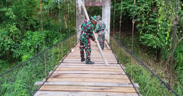 Polewali Mandar — Program karya bakti rehab jembatan gantung sepanjang 60 meter di Desa Lenggo, Kecamatan Bulo, Kabupaten Polewali Mandar, kini memasuki tahap akhir. Jembatan yang menjadi urat nadi aktivitas masyarakat itu direhab oleh prajurit Kodim 1402/Polman bersama warga setempat atas petunjuk dan arahan dari Brigjen TNI Hartono, S.I.P. (Danrem 142/Tatag) yang nantinya menjadi bagian dari pengembangan kawasan transmigrasi di Prov Sulawesi Barat.